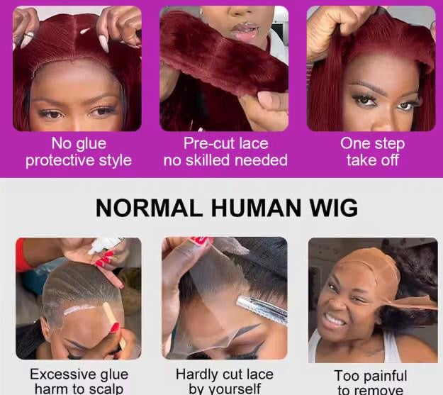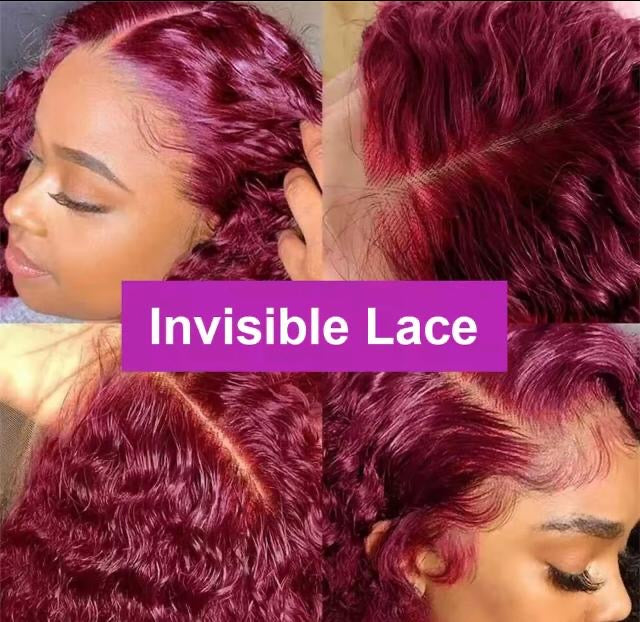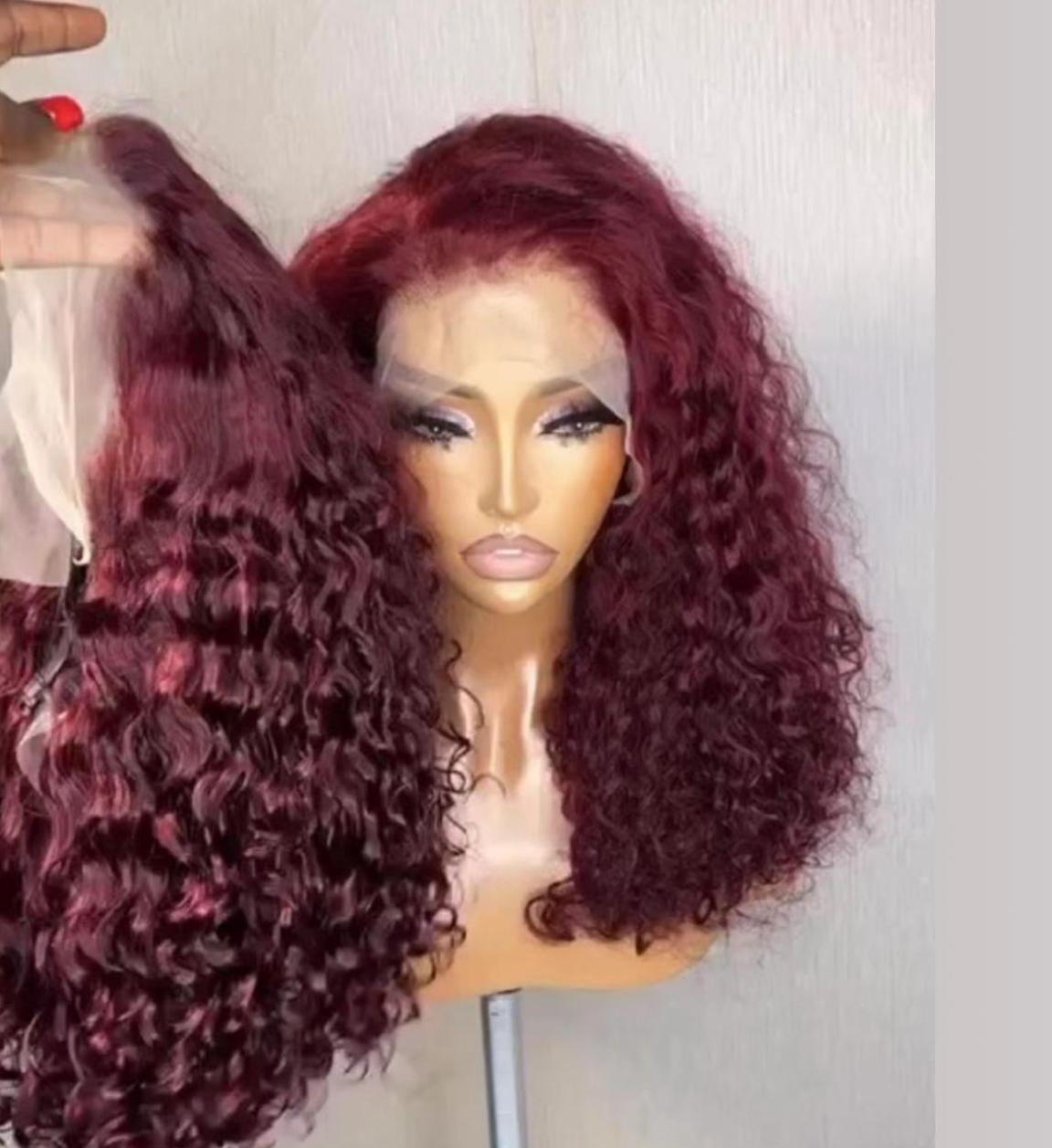 Perruque cheveux humain bouclés couleur 99J. ( rouge bordeaux ) 16pouces closure 13/4 . Densité 200